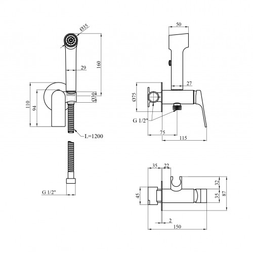 Комплектація включає душовий гарнітур із круглою лійкою діаметром 35 мм і гнучким шлангом довжиною 1200 мм — оптимальне поєднання зручності й функціональності.