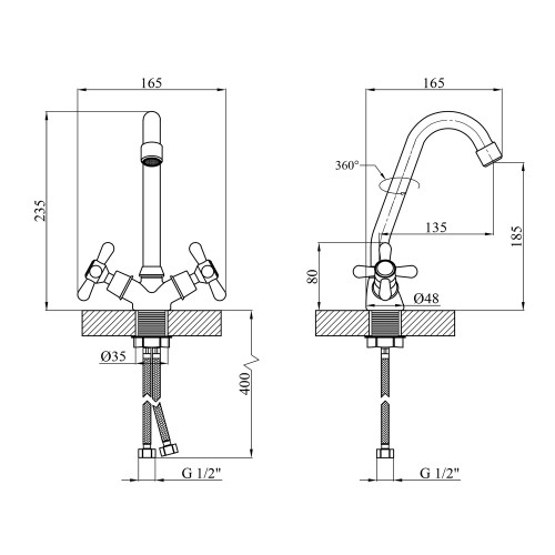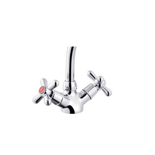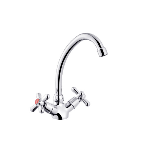 Змішувач для кухні Kroner KRP Royce - C030 виготовлений з високоякісної харчової латуні, яка стійка до впливу корозії, ударів і появи тріщин. Глянсове хромоване покриття не тільки підвищує довговічність змішувача, а й надає йому привабливості. Змішувач має вентильне управління, за допомогою якого можна відрегулювати температуру і натиск холодної та гарячої води. Виконаний в сучасному дизайні з поворотним виливом, який ідеально доповнить інтер‘єр кухні.