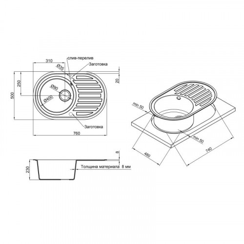 Комплектація Мийка, сифон, злив/перелив, корзинчастий вентиль, кріплення.