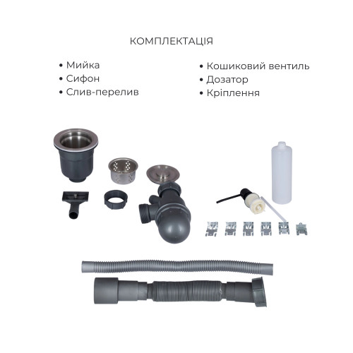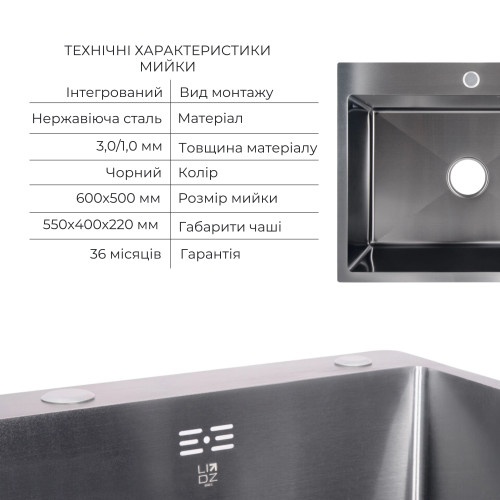 Комплект Lidz Handmade H6050B (BlackPVD) представляє чорну інтегровану мийку з дозатором і кошиком Lidz K01B, створюючи гармонійний ансамбль для вашої кухні.