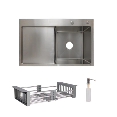Комплект Lidz Handmade H7849L (Brushed) пропонує збільшену мийку з лівим крилом, фінішем Brushed, дозатором для мийного засобу та кошиком Lidz K01G. Ідеальний вибір для великих кухонь.