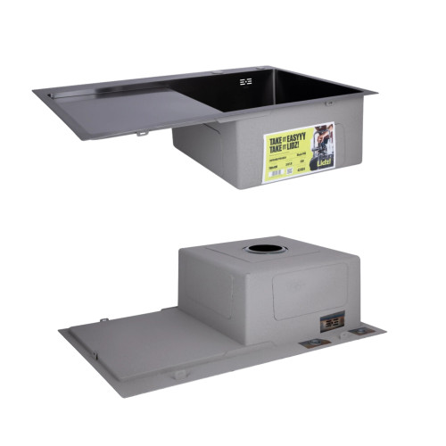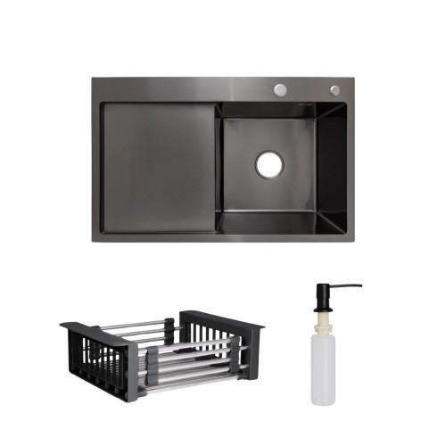 Комплект Lidz Handmade H7849BL Мийка для кухні інтегрована крило зліва BlackPVD у комплекті з дозатором + Lidz K01B Корзина для кухонної мийки