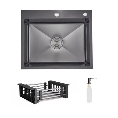 Інтегрована мийка з нержавіючої сталі з ефектним чорним покриттям Black PVD та рельєфним малюнком Honeycomb. У наборі – дозатор та кошик для повного комплекту кухонного оснащення.
