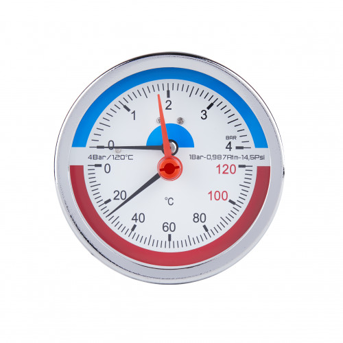 Термоманометр Thermo Alliance Standart 80 мм 1/2", заднє підключення SD1734B - комбінований прилад для одночасного вимірювання і контролю тиску та температури. Термоманометр конструктивно об’єднує в собі два прилади: манометр і термометр в одному корпусі, має дві шкали - тиску і температури.