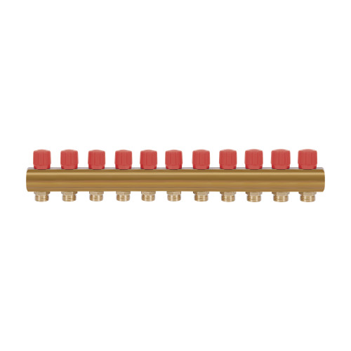 Колектор Icma з регулювальними вентилями 1" 11 виходів №1105 (Red) призначений для функціонування у складі системи ГХВП. Ручки ручного регулювання червоного кольору. Пристрій дозволяє під’єднати одинадцять ліній, що ведуть до точок споживання (змішувачі, душові кабіни тощо). Така гребінка дозволяє забезпечує рівномірний розподіл води, спрощує монтаж, підвищує рівень комфорту при експлуатації сантехнічних приладів. Матеріал виготовлення — латунь. Виходи — із зовнішньою різьбою 3/4 дюйма.