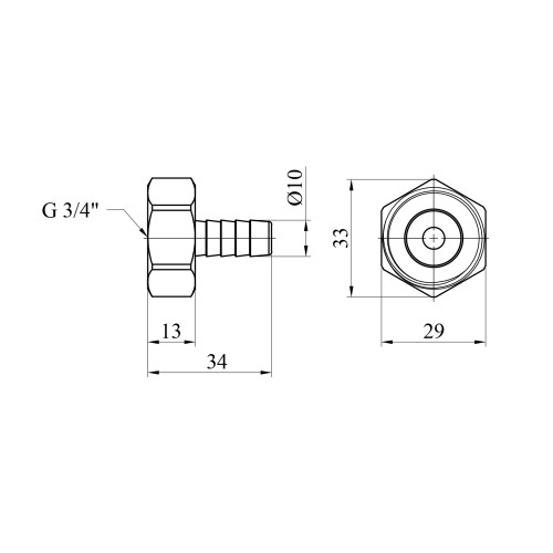 Штуцер Karro 3/4" РВ, D=10 мм нікельований KR-820 - це фітинг, призначений для під'єднання гнучких шлангів або труб до елементів трубопровідної арматури або устаткування, що мають зовнішнє різьблення 3/4 дюйма. Завдяки нікельованому покриттю він відмінно протистоїть корозії та зберігає привабливий зовнішній вигляд. Штуцер має внутрішнє різьблення 3/4 дюйма (РВ — різьблення внутрішнє) з одного боку і ялинковий наконечник (під шланг) діаметром 10 мм з іншого.