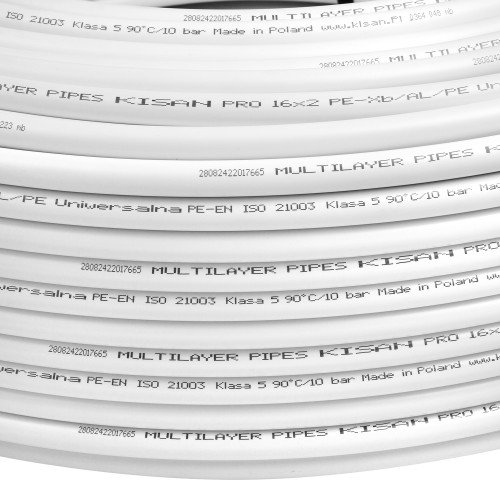Kisan 16x2 мм — універсальна труба для систем опалення, гарячого та холодного водопостачання. Поєднання поліетилену та алюмінієвого шару забезпечує міцність, гнучкість і довговічність. Безшовна конструкція виключає ризик протікань, труба витримує температуру до +95°C і придатна для питної води.