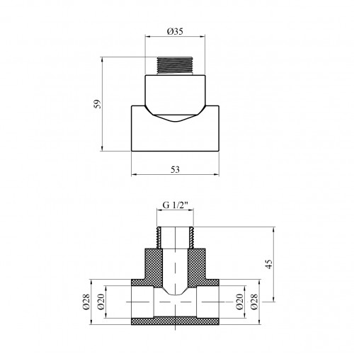 Розміри: Один кінець - 20 мм, інший - 1/2" (різьбове з'єднання РЗ).