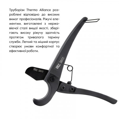 Ножиці для пластикових труб Thermo Alliance STD-001 призначені для професійного використання і відповідають високим стандартам якості. Ідеально підходять для різання полімерних труб діаметром до 25 мм. Ріжуча частина виконана з нержавіючої сталі преміум-класу з тефлоновим покриттям, що гарантує тривалу гостроту леза. Корпус виготовлений з легкого та міцного алюмінієвого сплаву, що забезпечує надійність та зручність у використанні. У комплекті додається запасне лезо.