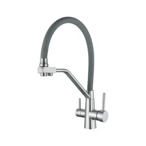 Матеріал: харчова нержавіюча сталь марки SUS304. Тип корпуса: двоважільний. Вилив: високий, поворотний, гнучкий. Висота змішувача: 45 см. Комплектація: змішувач, кріплення, шланги для підводу води 50 см.