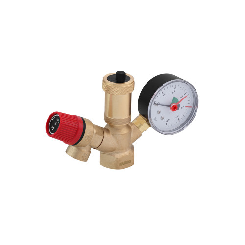 Група безпеки з виходами під 45° Karro латунний KR-88138 - це надійний пристрій, призначений для захисту закритих систем опалення та гарячого водопостачання від надлишкового тиску й утворення повітряних пробок. Особливість цієї моделі — кутові виходи під 45°, які забезпечують зручність монтажу навіть в обмежених просторах колекторних вузлів.