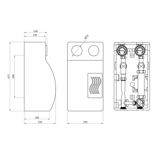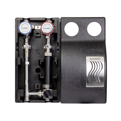 Насосна група Karro 1" (термостат+триходовий змішувальний кран) KR-15177. Насосна група належить до категорії опалювального обладнання і має широке використання при подачі теплоносія в прямий опалювальний контур і підтримці температури. Застосовується переважно в контурах опалення радіатора. Монтується на розподільчому колекторі (не входить до комплекту). У комплектації цієї моделі входить триходовий змішувальний кран з електричним сервомотором. Насос до комплекту не входить.