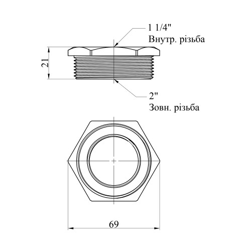 Розміри різьби: зовнішня 2 дюйми з одного боку, внутрішня 1 1/4 дюйма з іншого боку.
