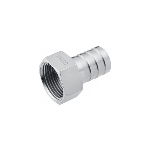 Штуцер Karro 3/4" РВ, D=20 мм нікельований KR-820 - це фітинг, призначений для під'єднання гнучких шлангів або труб до елементів трубопровідної арматури або устаткування, що мають зовнішнє різьблення 3/4 дюйма. Завдяки нікельованому покриттю він відмінно протистоїть корозії та зберігає привабливий зовнішній вигляд. Штуцер має внутрішнє різьблення 3/4 дюйма (РВ — різьблення внутрішнє) з одного боку і ялинковий наконечник (під шланг) діаметром 20 мм з іншого.