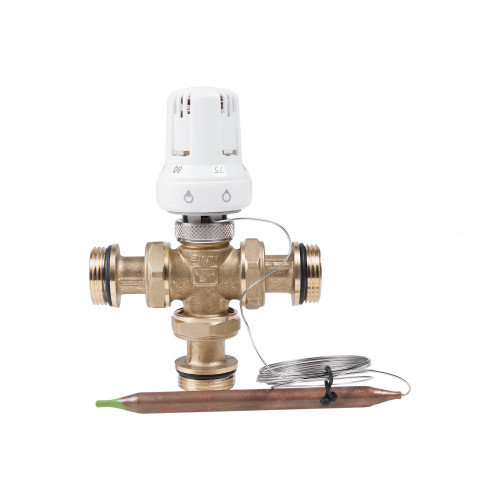 Термостатичний змішувальний зонний клапан ICMA Арт. 324 1" з термостатичною головкою. Змішує воду з різними температурами для отримання середнього значення змішаної води. Прокладка з матеріалу стійкого до високих температур. Діапазон регулювання температури води 60-90°C, максимальна робоча температура - 110°C. Максимальний робочий тиск - 10 бар, максимальний диференціальний тиск - 1 бар. Виготовляється триходовий змішувальний клапан ICMA з високоякісної латуні.