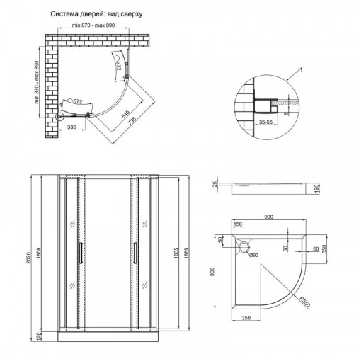 | Комплектація | Піддон, подвійні ролики, ручки, верхній профіль, нижній профіль, бічні профілі, набір ущільнювачів, розширювальні профілі, 2 скляні двері, 2 глухі скла, комплект кріплень, заглушки, елементи, що з'єднують, фіксатори, ніжки, сифон з гідрозатвором. |