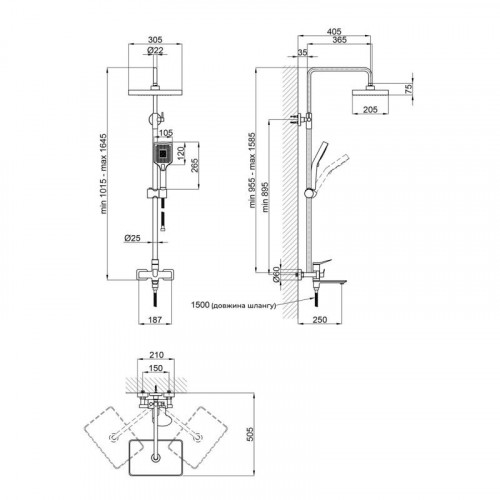 | Комплектація | Змішувач, кронштейн для верхнього душу, лійка для верхнього душу, кронштейн для ручного душу, лійка для ручного душу, душовий шланг, душова стійка, деталі кріплення. |