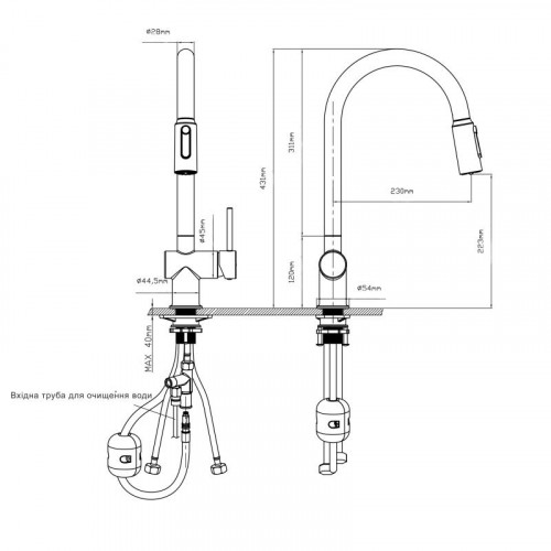 | Комплектація | Змішувач, шланги підключення, шланг під фільтровану воду, деталі кріплення. |