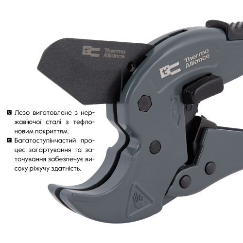 Ножиці для пластикових труб Thermo Alliance модель STD-002 створені для професіоналів і відповідають найвищим стандартам якості. Вони призначені для різання полімерних труб діаметром до 40 мм. Леза з нержавіючої сталі високої якості з тефлоновим покриттям забезпечують тривалу гостроту та ефективність різання. Храповий механізм дозволяє легко, точно і прямо різати труби однією рукою, докладаючи мінімальних зусиль. Корпус виконаний із легкого та міцного алюмінієвого сплаву. Зручна ручка з антиковзким покриттям. У комплекті є запасне лезо. Вага ножиць - 368 гр.
