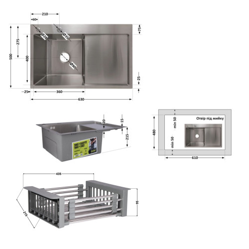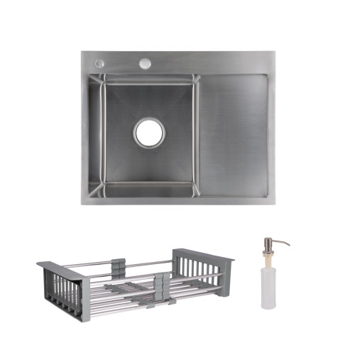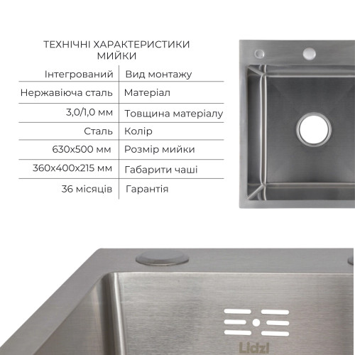 Комплект Lidz Handmade H6350R (Brushed) поєднує інтегровану мийку з правим крилом і шліфованою поверхнею Brushed, а також дозатор і кошик Lidz K01G для максимальної зручності.