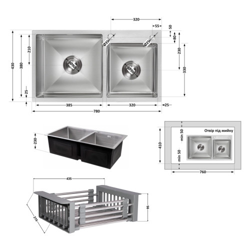Комплект Lidz Handmade H7843 Мийка для кухні з двома чашами інтегрована Brushed у комплекті з дозатором + Lidz K01G Корзина для кухонної мийки