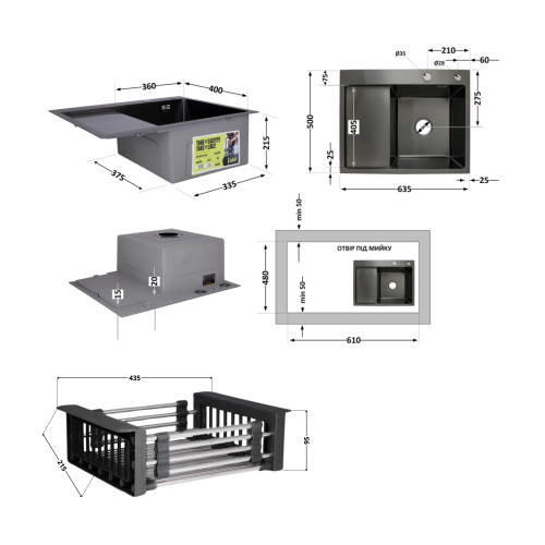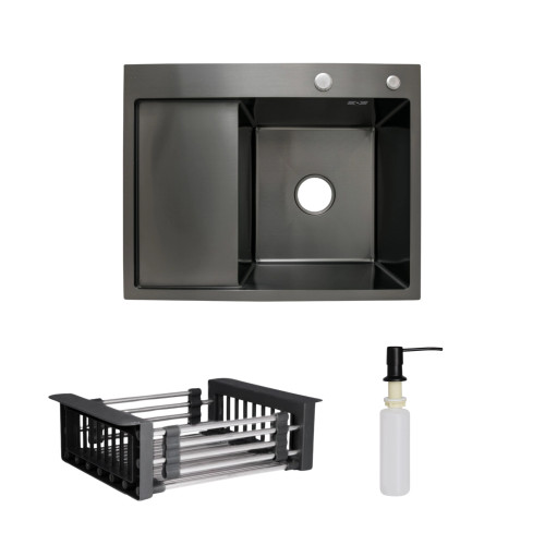 Комплект Lidz Handmade H6350BL Мийка для кухні інтегрована крило зліва BlackPVD у комплекті з дозатором + Lidz K01B Корзина для кухонної мийки