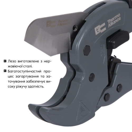 Ножиці для пластикових труб Thermo Alliance модель STD-003 створені для професіоналів та відповідають найвищим стандартам якості. Вони призначені для різання полімерних труб діаметром до 40 мм. Леза з нержавіючої сталі високої якості забезпечують тривалу гостроту та ефективність різання. Храповий механізм дозволяє легко, точно і прямо різати труби однією рукою, докладаючи мінімальних зусиль. Корпус виконаний з легкого та міцного алюмінієвого сплаву. Зручна ручка з антиковзким покриттям. У комплекті є запасне лезо.