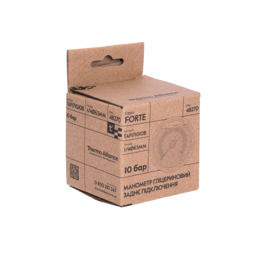 Thermo Alliance Forte TAF171G10B — гліцериновий манометр з діаметром корпусу 63 мм і латунним з’єднанням 1/4" З із заднім підключенням. Призначений для вимірювання тиску до 10 бар у водяних, повітряних та інших технічних системах. Наповнення гліцерином знижує вібрацію стрілки та подовжує термін служби пристрою.