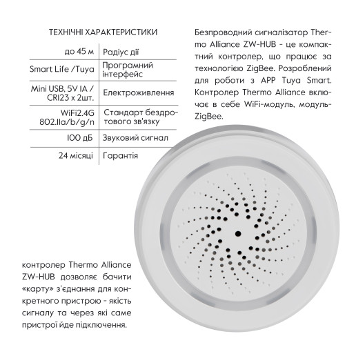 Бездротовий сигналізатор Thermo Alliance ZW-HUB - це компактний контролер, що працює за технологією ZigBee та розроблений для використання з додатком Tuya Smart. Контролер Thermo Alliance оснащений модулями WiFi і ZigBee, що дозволяє додавати до нього інші пристрої ZigBee, керувати ними, групувати, створювати смарт-сцени та багато іншого. Він запам’ятовує локальні смарт-сцени (сцени між пристроями, доданими до цього контролера) і забезпечує їх виконання навіть за відсутності WiFi-з’єднання або Інтернету. Крім того, контролер Thermo Alliance ZW-HUB дозволяє переглядати «карту» з’єднання для кожного пристрою - бачити якість сигналу та через які пристрої здійснюється підключення. Підтримується керування через мобільний застосунок Tuya Smart / Smart Life (доступний для Android та iOS).