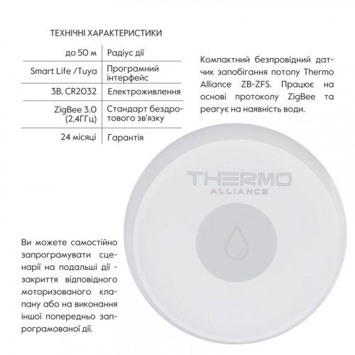 Компактний безпровідний датчик запобігання потопу. Працює на основі протоколу ZigBee та реагує на наявність води. Коли між двома контактами датчика з’являється вода, тобто контакти замикаються, подається сигнал на контролер та надсилається повідомлення на телефон або планшет в АPP Tuya Smart чи Smart Life. Ви можете самостійно запрограмувати сценарії на подальші дії - закриття відповідного моторизованого клапану або на виконання іншої попередньо запрограмованої дії. Для підключення до системи "Розумний дім" потрібен шлюз концентратор ZW-HUB