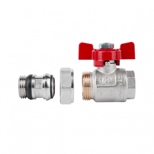 Повнопрохідний кульовий кран ICMA Арт. 348 1/2" з червоною ручкою "метелик", зовнішнім/внутрішнім різьбленнями, противибуховим штоком з подвійним гумовим кільцем, патрубком (система "Антипротікання"). Сфера застосування: системи опалення та охолодження. Матеріал виготовлення - латунь CW617N - UNI EN 12165. Максимальна температура - 150°C.