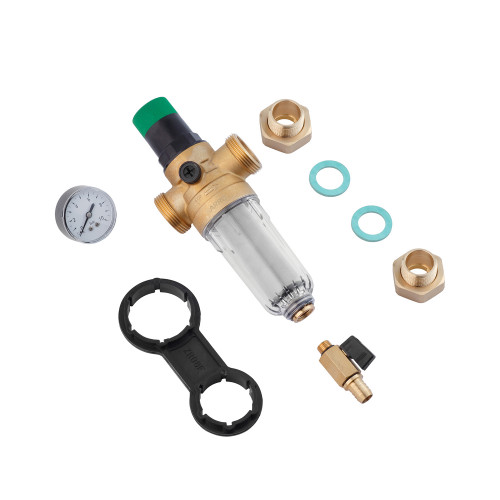 Фільтр самоочисний з редуктором тиску Karro 1" KR-8800 прозорий - це якісний аналог фільтра для холодної води Німецького виробництва Honeywell FK06 за привабливішою ціною. Пристрій обладнаний редуктором і системою прямої промивки, картридж - нержавіюча сітка 100 мкм. надійно очистить воду від механічних забруднень і сміття. Завдяки редуктора, який являє собою голову фільтра, ви самі легко виставити на шкалі необхідне вихідна тиск яке буде підтримуватися приладом, це дасть можливість вам економити витрати води, а так само надійно захистить водопровід і обладнання в магістралі від гідроударів, надлишкового тиску і відповідно від поломок і пошкоджень. Матеріал корпусу фільтра, з'єднувальні гайки і штуцера виготовлені з високоякісної латуні. Колба предфильтра - ударостійкий, стійкий до перепадів температур пластик. Фільтруюча сітка 100 мкм. - нержавіюча сталь. Доступний і ефективний за своїми властивостями фільтр - редуктор тиску.