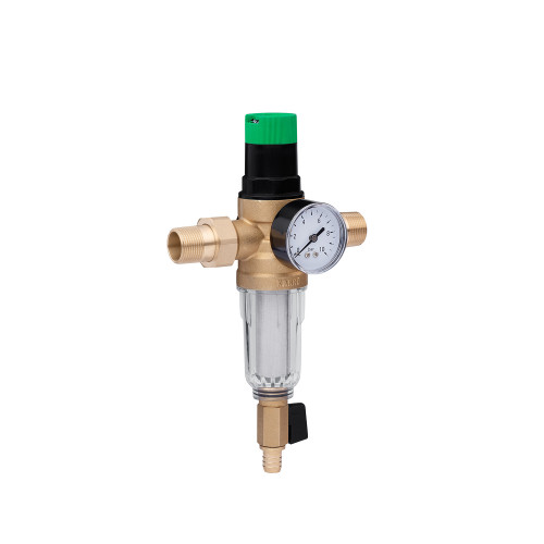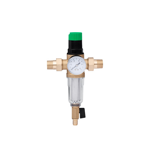 Фільтр самоочисний з редуктором тиску Karro 3/4" KR-8800 прозорий - це якісний аналог фільтра для холодної води Німецького виробництва Honeywell FK06 за привабливішою ціною. Пристрій обладнаний редуктором і системою прямої промивки, картридж - нержавіюча сітка 100 мкм. надійно очистить воду від механічних забруднень і сміття. Завдяки редуктора, який являє собою голову фільтра, ви самі легко виставити на шкалі необхідне вихідна тиск яке буде підтримуватися приладом, це дасть можливість вам економити витрати води, а так само надійно захистить водопровід і обладнання в магістралі від гідроударів, надлишкового тиску і відповідно від поломок і пошкоджень. Матеріал корпусу фільтра, з'єднувальні гайки і штуцера виготовлені з високоякісної латуні. Колба предфильтра - ударостійкий, стійкий до перепадів температур пластик. Фільтруюча сітка 100 мкм. - нержавіюча сталь. Доступний і ефективний за своїми властивостями фільтр - редуктор тиску.