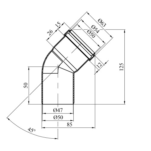 Коліно для внутрішньої каналізації Baux 50×45° — фасонний елемент, призначений для зміни напрямку трубопроводу у внутрішніх каналізаційних системах під кутом 45°. Забезпечує плавний поворот потоку і надійне з'єднання труб діаметром 50 мм.