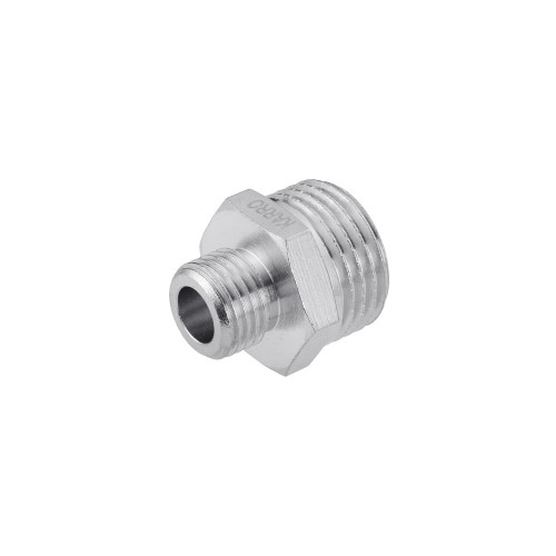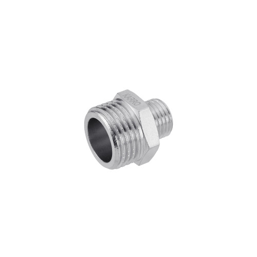 Ніпель перехідний Karro 1/2"х1/4" ЗЗ нікельований KR-3114 - компактний перехідник із зовнішнім різьбленням для стикування елементів з різними типорозмірами різьблення.