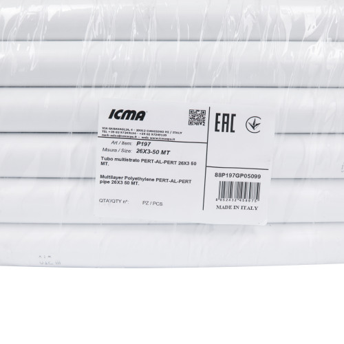 П'ятишарова металопластикова труба PE-AL-PERT ICMA Арт. P199 відповідає стандарту EN ISO15875, має максимальну температуру 110°C і робочий тиск 10 бар. З'єднання пластика (PE-RT) і металу (алюмінію) забезпечує трубі чудову якість, об'єднує переваги пластикових і металевих труб і виключає слабкі сторони обох матеріалів. Діаметр підключення труби - 26 мм.
