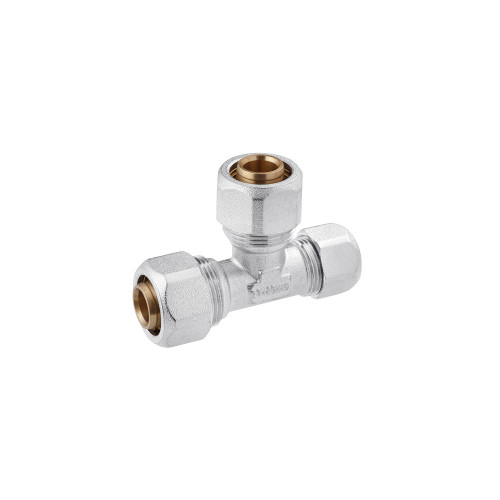 Трійник металопластиковий Karro 16x16x20 редукційний з'єднувальний використовується для під'єднання і розведення металопластикових труб, призначений для використання в системах гарячого і холодного водопостачання. За рахунок того, що фітинги виготовляються з латуні з великим вмістом міді, вони міцні та довговічні. Для запобігання окислення латунний фітинг покривається нікелем. Це дозволяє не тільки збільшити термін експлуатації, але і зберегти гарний зовнішній вигляд протягом багатьох років. Затискні фітинги - це ідеальний варіант, при виборі якісних та надійних з'єднань для металопластикових труб, а також труб зі зшитого або термостійкого поліетилену. Вони ідеально підходять для відкритого монтажу завдяки своїй багаторазовості, яка забезпечується формою конструкції, а також завдяки вишуканому нікельованому покриттю. Затискні фітинги дуже швидко і легко монтуються шляхом стиснення стандартним гайковим ключем, що робить процес збирання максимально комфортним.