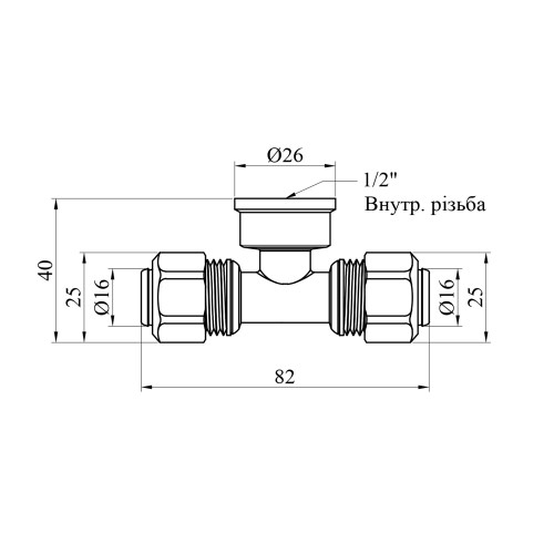 Розміри: 16 мм (для двох кінців металопластикової труби) і 1/2" РВ (для центрального відводу з внутрішньою різьбою).
