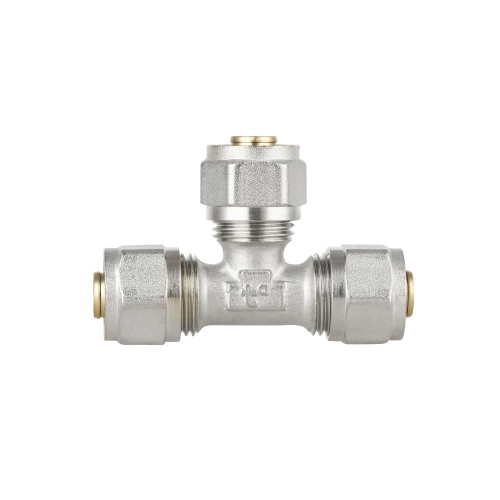 Трійник обтискний Thermo Alliance Forte Ø16 виготовляється з високоякісної латуні з нікельованим покриттям для монтажу трубопровідних систем.
