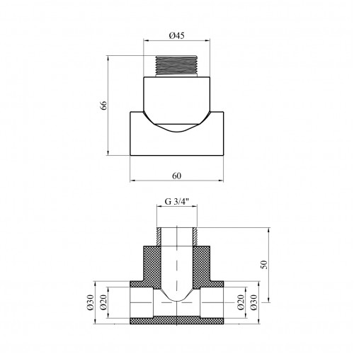 Розміри: Один кінець - 20 мм, інший - 3/4" (різьбове з'єднання РЗ).