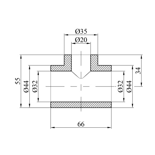 Розміри з'єднання: 32 мм - 20 мм - 32 мм (позначають розміри труб або переходів).