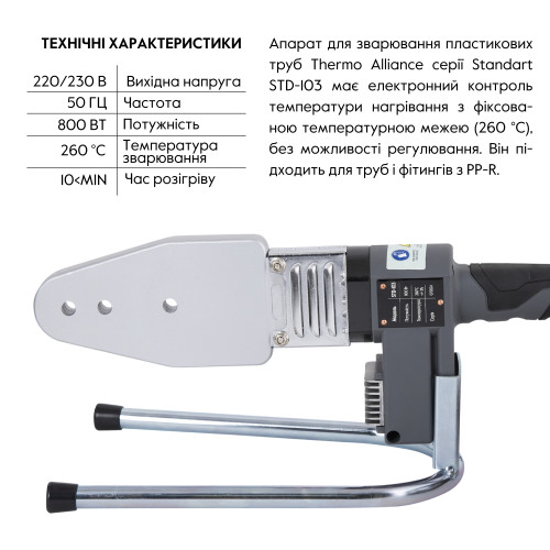 Thermo Alliance STD-103 Паяльник для PPR Ø20-63 (автоматичний), 800W розроблений для роботи з трубами більшого діаметра – від 20 до 63 мм. Потужний нагрівач на 800 Вт гарантує швидке та рівномірне нагрівання, що особливо важливо при паянні труб великого діаметру. Автоматична система керування полегшує налаштування та контроль температури, що мінімізує ризик неправильних з'єднань.