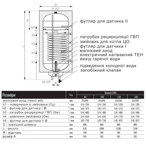 Водонагрівач електричний комбінований Thermo Alliance Neptun вертикальний 140 л. т.о. 0,95 кв.м правий, мокрий ТЕН 2,0 кВт (CWH 14048 11S R)
