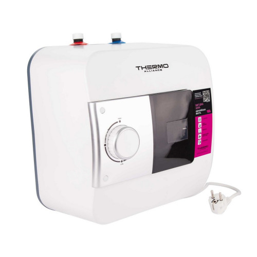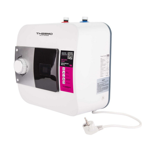 Водонагрівач Thermo Alliance 10 л під мийкою, мокрий ТЕН 1,5 кВт SF10S15N швидко нагріє невелику кількість води. Такий накопичувальний пристрій встановлюють в шафці під кухонним змішувачем. Патрубки підключення розміром1/2" розташовані у верхній частині корпусу приладу. Панель управління оснащена індикатором роботи нагрівального елементу, дисплеєм, що показує температуру нагрівання. Бак зроблений зі сталі, емальоване покриття служить антикорозійним захистом. Товщина внутрішнього бака - 2 мм.