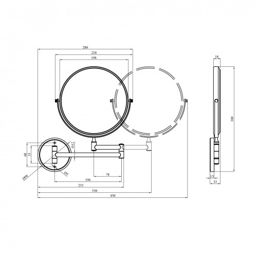Кругле дзеркало з 2-кратним збільшенням обертається навколо своєї осі, дозволяючи легко змінювати кут огляду. Телескопічний тримач забезпечує плавне регулювання відстані — ви можете наблизити дзеркало під час макіяжу або гоління, а потім скласти його до стіни.