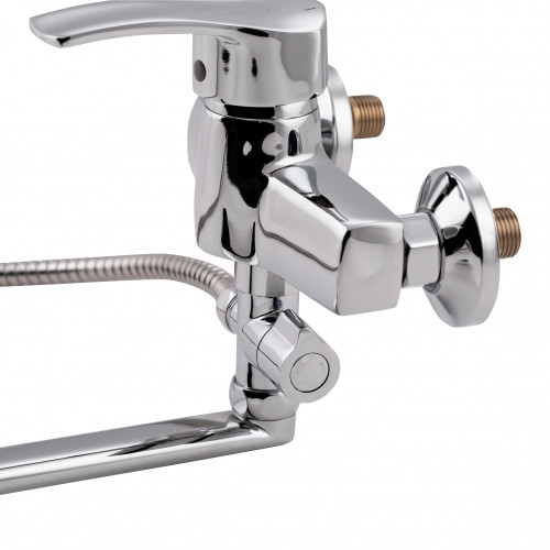 Змішувач для ванни Lidz (CRM) 41 86 005C-2 з довгим поворотним виливом виготовлено з цинку, укомплектовано кронштейном для ручного душу, душових шлангом і лійкою. Завдяки хромованому покриттю має міцну поверхню і привабливий зовнішній вигляд. Декоративні розетки приховають похибки установки на оздобленні кімнати. Напір води і її температура регулюються поворотом важеля в необхідне положення. Перемикання ванна/душ здійснюється за допомогою дивертора.