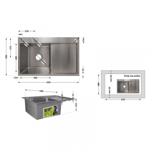 Мийка для кухні інтегрована Lidz Handmade H6350R крило праворуч (LDH6350BRUR45587) Brushed Steel 3,0/1,0 мм