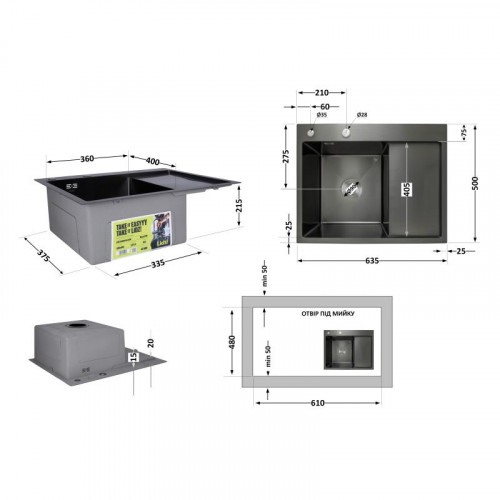| Комплектація | Мийка, сифон, злив/перелив, корзинчастий вентиль, дозатор, кріплення. |