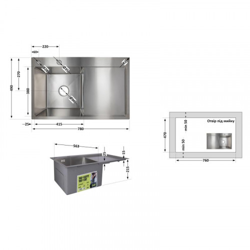 | Комплектація | Мийка, сифон, злив/перелив, корзинчастий вентиль, дозатор, кріплення. |