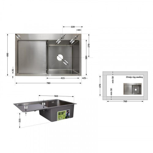 | Комплектація | Мийка, сифон, злив/перелив, корзинчастий вентиль, дозатор, кріплення. |